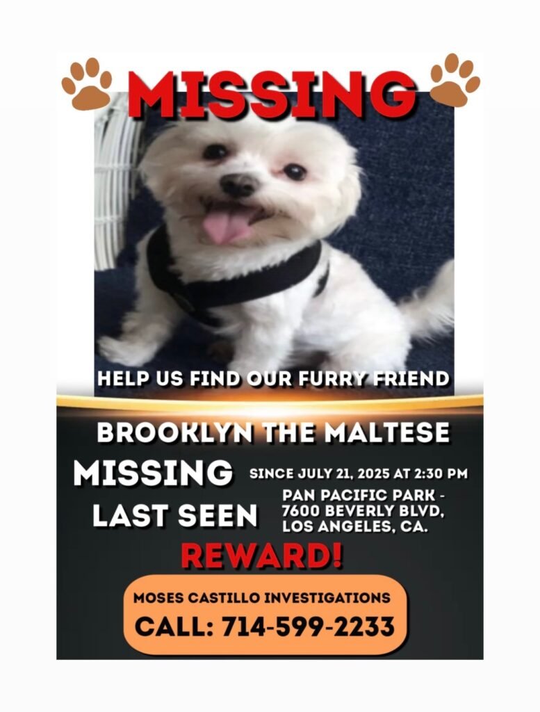 Help us find our furry friend. Missing since July 21, 2025 at 2:30PM. Last seen at Pan Pacific Park – 7600 Beverly Blvd, Los Angeles, CA. Call Moses Castillo Investigations 714-599-2233