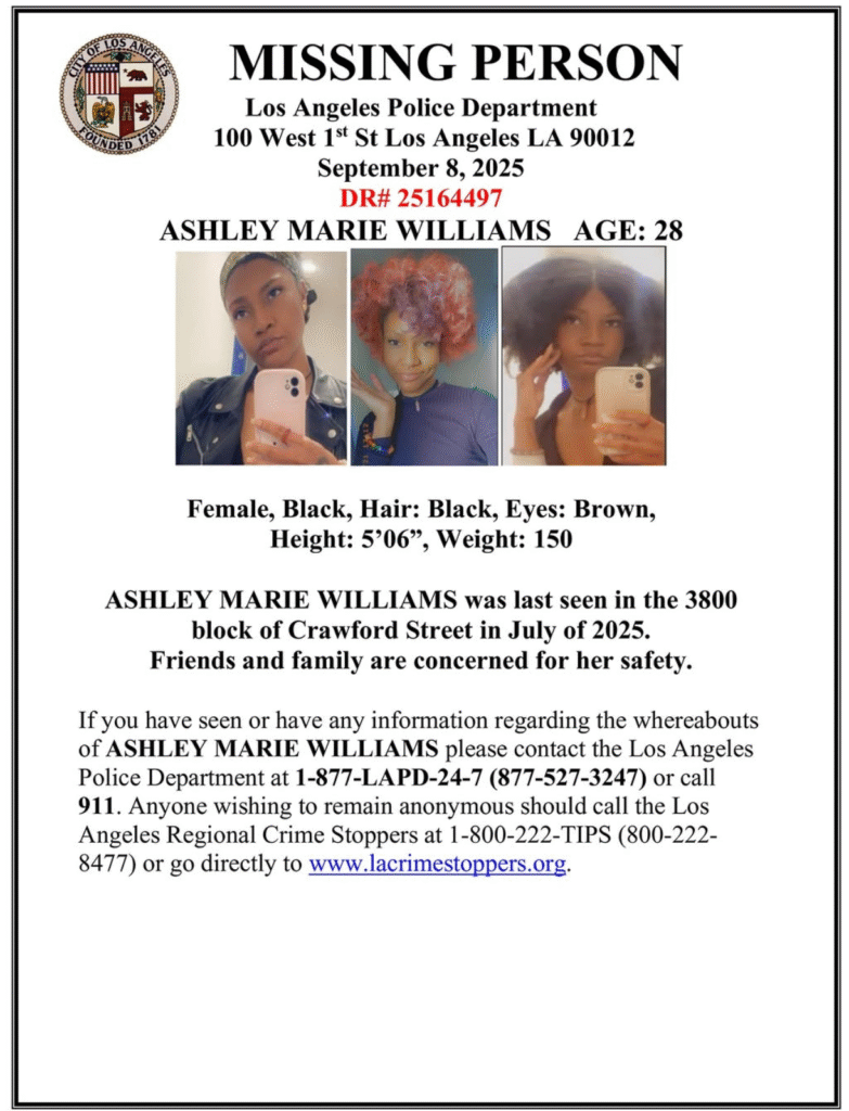 Ashley Marie Williams was last seen in the 3800 block of Crawford Street in July of 2025. Friends and family are concerned for her safety.